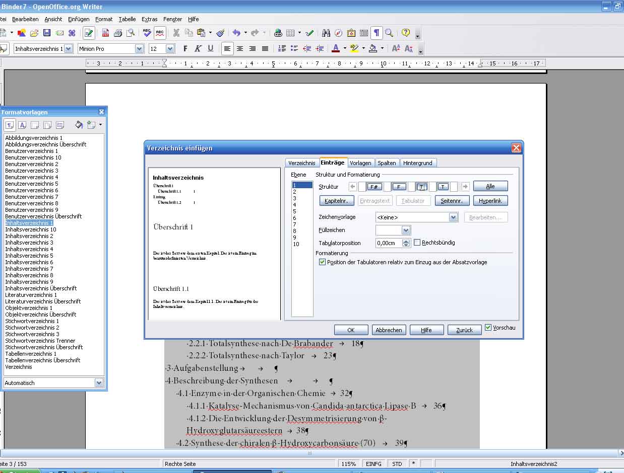 ich bin kurz davor meine Arbeit abzugeben und wollte das bisher im MS Word erzeugte Inhaltsverzeichnis im Openoffice erstellen, da die gesamte Arbeit im OpenOffice geschrieben wurde (Mach ich nie wieder !!). Anfänglich hatte ich nicht die Zeit mich damit zu beschäftigen. Nun aber sollte das Inhaltsverzeichnis ins Openoffice-Dokument integriert werden. Das automatisch erstellte Inhaltsverzeichnis sieht einfach sehr unschön aus. Ich musste auch feststellen, dass nach jedem Aktualisieren des Inhaltsverzeichnisses sofort wieder das Standardformat erscheint. Nun habe ich heute Vormittag versucht, das Inhaltsverzeichnis in die Form zu bringen, wie ich sie mit dem Word erstellt habe. Anbei das pdf aus der Word-Datei. Ich möchte nun diese Art Inhaltsverzeichnis im OpenOffice erstellen und jederzeit ohne Verlust der Formatierung aktualisieren können. Ich war nicht mal fähig, die gepunktete Hilfslinie zwischen Kapiteltitel und Seitenzahl zu entfernen. Wer kann mir zeigen, wo ich die Formatierung des Inhaltsverzeichnisses beliebig verändern kann. Unter "Verzeichnis bearbeiten" oder Absatz bearbeiten" konnte ich bisher nichts brauchbares finden.