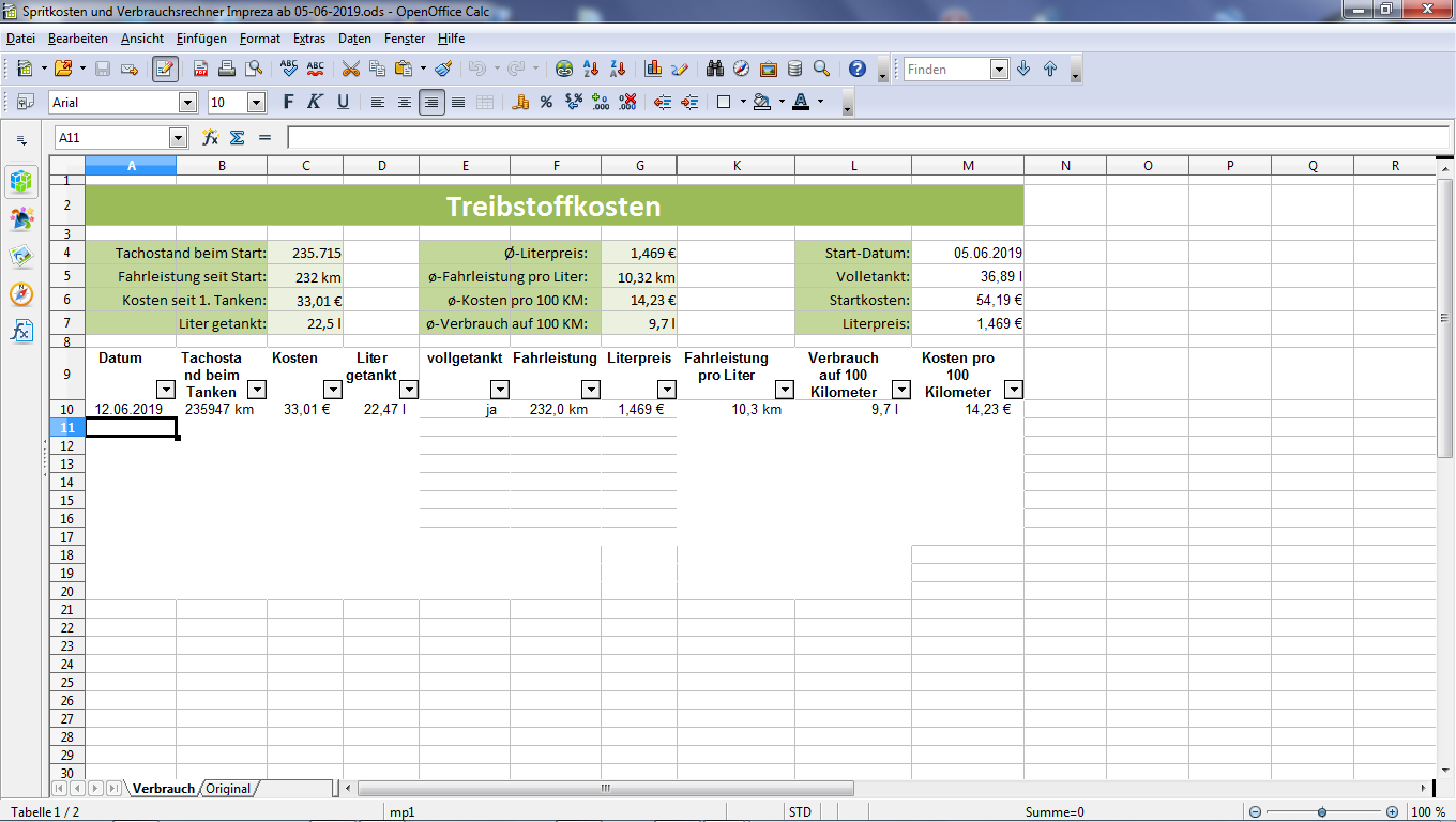 Ich möchte mir gerne eine Nachweis-Tabelle erstellen, Wann ich (wo) wieviel und zu welchem Preis getankt habe und wieviel mein Auto so auf 100km verbraucht hat - also so eine Art Fahrtenbuch führen. Eine einzige Excel-Vorlage habe ich finden können, die in etwa das ermöglichen könnte. Diese zeigt jrdoch in den Berechnungsfekdern nur "ERR 508", was auf Fehler in der Klammerung deutet! Beim Zählen komme ich aber für jede geöffnete Klammer auch auf eine schließende. Also denke ich da eher, daß OpenOffice Calc die "Wahr/Unwahr"-Anweisungen in den Formeln nicht versteht. Im Kopfbereich sind die Zeilen 1-9 Fest in der Ansicht, die übrigen lassen sich nach oben scrollen.In den Kopfzeilen sind auch einige Felder für eine Abschluß-Berechnung vorgegeben. Die Tabelle ist als "*.xlsx" Dokument abgelegt.