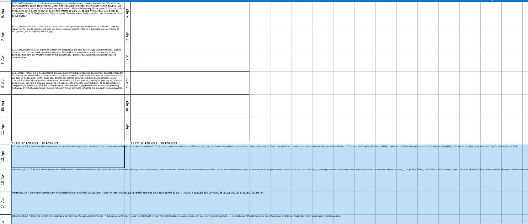Update: Frage mich soeben, wie du das gemacht hast - vor allen Dingen, wie das autom für eine 365 Zeilige Tabelle gemacht werden kann1?Matthäus 11,5;Armen wird das Evangelium gepredigt.;les aveugles voient, les boiteux marchent, les lépreux sont purifiés, les sourds entendent, les morts ressuscitent, et la bonne nouvelle est annoncée aux pauvres.