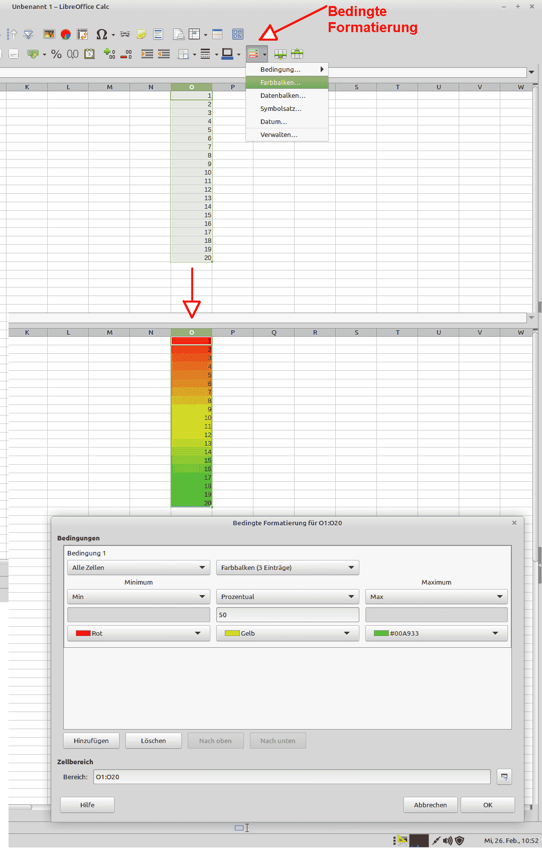 Der korrekt erzeugte (zweite) Farbbalken kann mit str+Z rückgängig gemacht werden. Um das Farbwahlmenü erneut aufrufen zu können darf man nicht denselben Weg (z.B. das Symbol Farbbalken) gehen (der geht nicht!), sondern muß über das Menü Format->bedingte Formatierung->Verwalten gehen. Dort ist der fragliche Bereich noch immer aktiv und kann editiert werden.