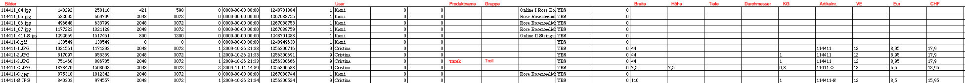 - ein Bild zu einem Artikel. Das bedeutet: hat ein Artikel mehr als ein Bild, kommt eine zweite Zeile zu dem selben Produkt Zustande.