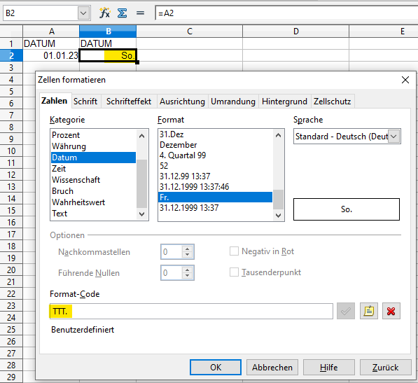 - 3 =WOCHENTAG(D3) plus irgendein Datumsformat