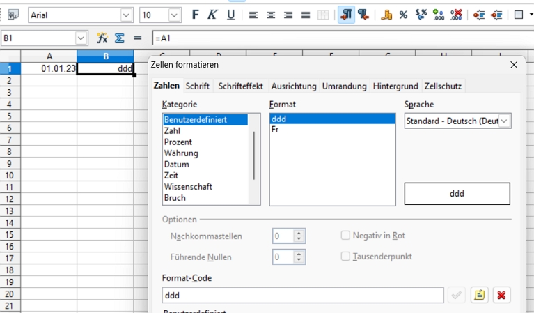 Ich habe hier ein LO in deutscher Lokalisierung, es funktionieren alle drei Formatcodes ddd, ttt oder nn gleichermassen!